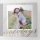 Ce design de vacances triplé unique présente un arrière - plan en bois lavé blanc et une typographie élégante. Le capot avant est simplement une photo carré unique. Lorsque vous ouvrez la carte, vous voyez une seule photo carré avec votre texte de vacances principal. Lorsque vous ouvrez la carte, vous voyez une photo à gauche, une photo à droite, et au milieu, trois petites photos horizontales avec du texte personnalisé. L'accueil à l'intérieur dit "Happiest Holidays" dans un faux script de feuille d'or. Le dos de la carte est vide mais vous pouvez facilement ajouter une autre photo ou plus de texte. Ce design est un choix parfait pour un message chaleureux et sincère de joie de Noël. La mise en page multi-photo vous permet de télécharger un total de SEPT de vos photos de famille préférées en différentes tailles. Le look est simple, mais élégant avec une ambiance de ferme.