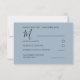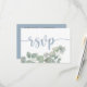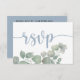 Carte rsvp de mariage simple et moderne avec typographie élégante en bleu poussiéreux sur un arrière - plan blanc, avec ajout d'aquarelle d'eucalyptus feuillage. Customisez facilement.