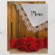 Customisez le Menu de Mariage d'hiver Rustique Rouge Poinsettia avec les noms de la mariée et du marié, l'emplacement du lieu et les détails du repas que vous pourrez servir lors de votre déjeuner de douche nuptiale de décembre ou de Noël, brunch post-mariage ou dîner de réception de mariage. Ce menu de mariages à thème rural décontracté mais élégant présente une photographie florale d'une fleur de poinsettia rouge, un ruban de burlap rouge et un mouchoir en lin taillé en dentelle vintage avec un arrière - plan en bois de grange brun. Idéal pour organiser votre événement de fête à la ferme.