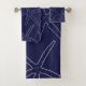 Cet ensemble de serviettes de bain dispose d'une ligne blanche illustrée motif d'étoiles de mer et de dollars de sable. L'arrière - plan est bleu marine, mais peut être changé à n'importe quelle couleur de votre choix. Parfait pour la décoration sur la plage, la côte ou la mer.