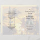 Dollars de sable et palmiers plié programme de mariage modèle. Utilisez quatre pages pour customiser ce programme de cérémonie pour votre mariage tropical / plage. Un côté contient une image d'arrière - plan tropical ensoleillé avec de grands palmiers. Une fois plié, chaque côté devient l'avant et l'arrière du programme. L'inverse est jaune clair avec du texte noir avec beaucoup d'espace pour une longue cérémonie de mariage. Inclure un message de remerciement sous l'écriture "l'amour est patient" sur la dernière page.