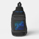 Create a custom sling bag with a Chicago theme. Front facing design features the Chicago skyline in blue and black colors. Modern look. Personalize with your name and text. Perfect for travel and on the go. Use the template to create your own Chicago custom sling bag.