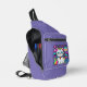 Sac adorable avec un chat kitty en caricature blanc, mignon, fantaisiste, avec de grands yeux bleus, des oreilles roses et portant un collier coloré. Elle a une jolie queue rayée bleue, rose et blanche et une bande bleue sur la tête. L'arrière - plan est principalement violet avec des planètes, des nuages, des étoiles et des fleurs dans un mélange de couleurs audacieuses, vives et vives. Idéal pour tous ceux qui aiment les chats et l'espace.