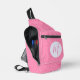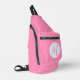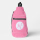 Sling bag with light pink squiggly squares and a pink personalized initial inside a white fractal of squiggly squares. Looks great on any lady's shoulder for school, work, or office. Could be a lovely Mother's Day gift for the right mom.