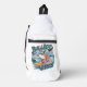 Un Bulldog pubred se balance habilement sur une planche de surf alors qu'il surfe sur une vague massive, montrant ses impressionnantes capacités de surf près d'une île tropicale.