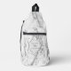 Sur ce élégant sac à élingue est un motif en marbre blanc et argenté classique avec des flux de cire argentée pour une toile de fond avec un élégant design de fleur de lotus argentés où à l'avant vous pouvez le personnaliser avec un nom ou logo créant une ambiance zen.