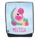 Sac à dos personnalisé avec une jolie illustration d'un flamant rose avec quelques pastèques et ananas. Couleurs rose et vert. L'été et tropical. L'arrière - plan est une aquarelle bleu clair