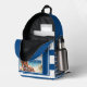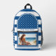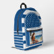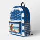 Sac à dos bleu marine et blanc avec motif rayé avec pois et votre photo personnalisée (en option, vous pouvez également laisser la peinture de la dame sur la plage si vous le souhaitez). Beau pour tous ceux qui aiment le look nautique ou pour des vacances sur la côte.