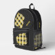 Two-tone black and yellow. Checkered appliqués on a black backpack. Add your name to the front and your text to the right and along the zipper. Alternatively, you can change the appliqué designs to your own images or pattern.