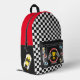 Ce sac à dos de retour à l'école est parfait pour un élève qui aime les voitures de course, et la course à la dérive. Le design comprend des voitures déplaçant sur une piste de course, un trophée de course et des drapeaux de course. Personnalisez le sac à dos avec votre nom ou ajoutez un court texte personnalisé.