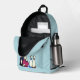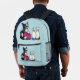 Un chat ludique tient une boule de bowling rouge, assis à côté de deux épingles de bowling étonnées avec des rayures bleues et rouges.