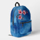 This floral feminine backpack features watercolor painted pink cherry blossoms an butterflies on a blue watercolor background. Customize it with your name at the side.