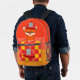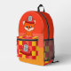 A cool backpack featuring a firefighter (fire) like pattern, a fire hat and a fox with a fire hat. The fox from the book "Firefighter Fox".