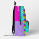 Sac pour enfants arc-en-ciel amusant parfait pour l'école, l'université ou les clubs d'enfants et de dormir sur les tovers. Customisez avec le nom de votre choix. Cet exemple montre Bethany sur le devant et son nom complet, sa classe, son slogan ou son nom de maison sur le dessus. Rose vif, aqua, violet et bandes arc-en-ciel colorées rendent ce sac super facile à repérer! Art graphique et design original par Sarah Trett pour www.mylittleeden.com sur Zazzle.