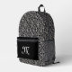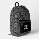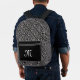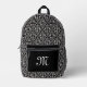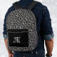 Ce sac à dos a un motif damassé élégant fait en noir et blanc. Il a des parchemins blancs fantaisistes sur le noir. La poche avant est noire où vous pouvez customiser votre initiale ou votre texte avec le modèle.
