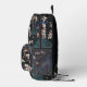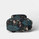 Cet élégant sac à dos imprimé à fleurs de Magnolia et Peacocks Turquoises, dessiné dans le style de la Chinoiserie, est orné de paons bleus et turquoises dessinés à la main, perchés sur des branches d'arbres de Magnolia, en fleurs sur un élégant arrière - plan presque noir aux silhouettes de fleur de magnolia.