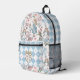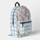 Vintage Alice au pays des merveilles sac à dos personnage conte de fées. Le design comprend des personnages Alice in Wonderland, le chapeau fou, Alice, le lapin blanc, les fleurs, et des éléments de fête de thé conte de fées motif conçu sur l'avant avec les côtés et la poche avant conçu avec un élégant motif en damier bleu et blanc. Personnalisez avec deux monogrammes à deux lettres affichés dans notre design de cime de couronne cardiaque. Conçu par Moodthologie.
