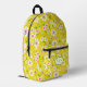 Un motif de gorge lumineux et ensoleillé présente des fleurs blanches avec des centres rose et vert sur arrière - plan jaune. Personnalisez ce sac à dos avec monogramme ou nom en blanc et vert ovale