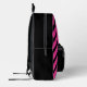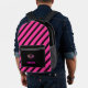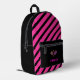 Pink and Black Stripes Moderne Monogramme Pickleball Sac imprimé Un design personnalisé sur un arrière - plan motif à bandes roses et noires avec une illustration de pickleball qui peut facilement être remplacé par télécharger votre propre logo, image ou motif. Le nom monogramme personnalisé dans la typographie de bloc moderne rose choquant peut être remplacé par votre propre nom ou texte personnalisé. Le cadeau ou l'accessoire parfait !