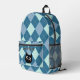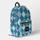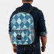 Un beau sac à dos avec un motif de Jacquard bleu vintage. Un modèle pour ajouter votre nom ou autre texte et un dessin d'un chat noir. L'image du chat est également un modèle à utiliser tel quel (si vous aimez les chats), remplacer par votre propre image ou supprimer pour laisser vide.