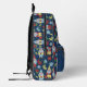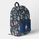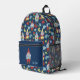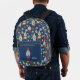 Ce sac à dos à motifs a un style rétro moderne avec des illustrations de mignons gnomes de jardin avec barbe blanche dressée contre un arrière - plan bleu marine et entourée de fleurs en rouge, jaune et bleu clair sur tiges vertes. Il y a un emplacement sur la poche avant pour personnaliser ce sac à dos avec vos propres initiales monogrammes en lettres bleu clair.