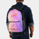 sur ce sac à dos se trouve une licorne mythique et colorée avec des étoiles sur un fond pastel arc-en-ciel rose lavande à l'ombre, avec parties scintillant rose et lavande, où l'on peut la personnaliser sur la poche avant pour la rendre unique. Vibes d'imaginaire magique.