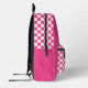Pink White Checkerboard Check Motif Logo Le sac à dos imprimé comporte un motif rétro rose et blanc à damier avec votre logo d'entreprise personnalisé. Parfait pour les cadeaux d'entreprise, l'école, les sports, la salle de gym, les voyages et plus encore. Conçu par ©2025 Evco Studio www.zazzle.com/store/evcostudio