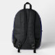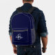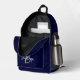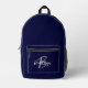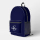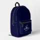 Ce sac à dos personnalisé est doté d'un monogramme et d'un prénom en écriture moderne gris et blanc sur un arrière - plan bleu marine.