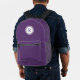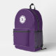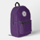 Le sac à dos violet cool est muni d'un monogramme violet gras dans un cercle blanc avec une bordure violette étroite et un mince anneau blanc extérieur. Ajoutez votre initiale dans la barre latérale.