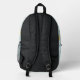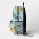 Les dinosaures bleus et dorés font un mignon motif sur le sac à dos de cet enfant. Avec les dinos, on trouve des arcs-en-ciel et des nuages de style boho. Tout est posé sur un arrière - plan bleu clair.