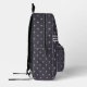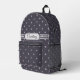 Ce sac à dos est muni d'un nom dactylographié violet en prune poussiéreuse sur une bande de style Déco rose pâle au-dessus de la poche sur un motif en diamant sur un violet de prune poussiéreux avec des bouquets de diamants aux intersections.