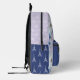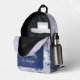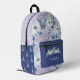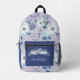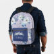 Design chic et élégant sac à dos à motifs floraux de la tour Paris Eiffel. Le design présente un motif floral blanc, violet et bleu imprimé à la main avec le motif de la tour Eiffel. Personnalisez la poche avant avec nom dans un script élégant. Conception et illustrations par Moodthology Papery.
