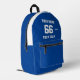 Créez votre propre sac à dos imprimé style football sport bleu blanc personnalisé avec le nom, le numéro, le nom de l'équipe, le slogan et l'année. Personnalisez ce simple modèle de sac à dos imprimé classique avec votre message personnalisé, nom, nom d'équipe et année. Personnalisez-le facilement pour un sport cool. Créez votre cadeau personnalisé unique pour entraîneur, anniversaire de garçon, footballeur, coéquipiers et amis.