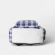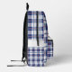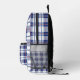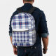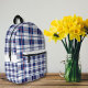 C'est un sac à dos à la mode, plaid, en rouge, blanc et bleu.