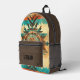 Ce sac à dos présente un design amérindien/sud-ouest qui ressemble à un coup de soleil en bronze, turquoise, corail et noir. Les côtés et le dessus du sac à dos sont un faux daim avec couture dessus. Une poche spacieuse se trouve à l'avant qui est également faite dans le daim marron et vous personnalisez avec votre nom.