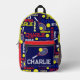 Tennis sport rouge blanc bleu jaune personnalisé sac à dos. Sport balle de tennis et raquette sur un sac de nom personnalisé arrière - plan violet bleu foncé. Ce sac à motifs typographique à thème sportif a des balles de tennis et des racquets qui frappent les balles avec du texte bleu foncé, rouge, rouge foncé, jaune, jaune clair et blanc. Ce design sportif amusant peut être customisé avec votre propre nom, dit actuellement Charlie. D'autres boules de sport de ce style et des options de couleurs sont disponibles ou peuvent être créés sur demande. Conçu par Sarah Trett pour www.mylittleeden.com sur zazzle.