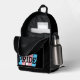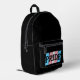 Backpack with text in the colors of the transgender pride flag. Pink, white, and blue flag of the trans pride movement, on a blue background