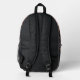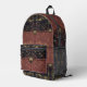 Old world European, exotic and dark, with a slight flavor of the Orient, the beautiful pattern by ZoeSPEAK, in natural colors on this Backpack, was made from Zoe’s original photograph of wrought iron latticework and tropical print fabric. Palm fronds and other tropical leaves, in shades of pale greens, terracotta and beige, rest gracefully on a black background behind the latticework. The design is in the style of a clutch bag or purse, with a floral medallion button closure on a dark background, smooth fabric flap over a faded burgundy textured fabric of the same pattern. The flap is edged with a salmon pink grosgrain ribbon.