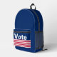 Ce sac à dos bleu foncé a Vote en lettres blanches sur la poche. Des rayures rouges et blanches traversent la poche et sous le texte.
