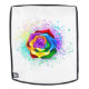 Grand rose fleuri avec pétales arc-en-ciel sur arrière - plan blanc, peint sur des éclaboussures de peinture colorée et lumineuse. 3d
