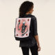 Ce sac à dos pour adultes à visage gras avec une face avant interchangeable a un demi squelette de type gothique tenant une seule rose rouge sur une tige au-dessus de sa tête. Des roses plus rouges avec des feuilles verts accentuent les angles sur un centre rouge qui s'estompe en arrière - plan rose. Customisez votre nom avec le modèle.