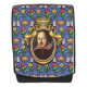 The Bard - L'oeuvre originale de ZoeSPEAK sur ce sac à dos présente un portrait de l'auteur William Shakespeare. Le portrait est dans un cadre orné d'or ovale avec des rubans et une couronne sur le dessus. Le papier peint arrière - plan bleu est orné de châteaux, de couronnes de rois et de fleurs jaunes et rouges, rappelant l'romantisme, la tragédie et la comédie de ses pièces de théâtre et de poésie.