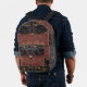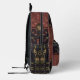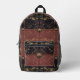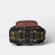 Européen de l'ancien monde, exotique et sombre, avec une légère saveur de l'Orient, le beau motif de ZoeSPEAK, dans des couleurs naturelles sur ce sac à dos, a été réalisé à partir de la photographie originale de Zoe de ferronnerie en treillis et de tissu à motif tropical. Des feuilles de palmier et d'autres feuilles tropicales, dans des nuances de verts pâles, de terre cuite et de beige, reposent gracieusement sur un fond noir derrière le treillis. Le design est dans le style d'un sac à main ou d'une pochette, avec une fermeture à bouton en médaillon floral sur fond sombre, un rabat en tissu lisse sur un tissu texturé bordeaux délavé du même motif. Le rabat est bordé d'un ruban gros-grain saumon.