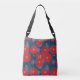 De grandes fleurs rouges écarlate, bleu marine moyen et de petites fleurs violettes royales ressemblant à des marguerites sont disséminées dans un riche arrière - plan vert jungle pour créer un motif floral coloré qui est parfait même pour l'automne. Customisez le monogramme avec votre propre initiale pour faire un accessoire unique. Ce sac est disponible en plusieurs tailles et à la fois les styles de sac sac fourre-tout et de sac de carrosserie.