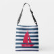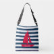 Sac carrossable rayé bleu marine et blanc décoré d'un bateau rouge et personnalisé avec votre nom dans une police de caractères moderne. Parfait pour des vacances d'été au lac ou pour prendre quelques choses avec vous sur le voilier ou bateau de croisière.