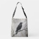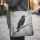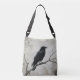 Elevate your everyday style with a mysterious edgy vibe using this versatile crossbody bag. This design features a vintage raven art illustration perched on a stark branch, rendered in an inky black and grey palette with a weathered parchment texture. It is a thoughtful bird lover gift or a perfect accessory for those who appreciate a minimalist noir aesthetic.