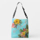 Sac cadeau personnalisé pour la demoiselle d'honneur. Impression sur tout le motif de belles fleurs tropicales. Les fleurs d'hibiscus rose et jaune, ainsi que le plumeria et l'anthurium composent le design sur le devant. Son initiale de prénom est imprimée en rose foncé dans le coin supérieur. De l'autre côté, "demoiselle d'honneur" est incliné, avec plus de fleurs et un perroquet pour compléter le thème tropical. Un graphique bleu aqua de fond recouvre le sac, qui est disponible en deux tailles et styles.