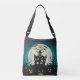 Ce sac fourre-tout d'Halloween, d'une élégance sombre, a un arrière - plan bleu profond qui montre la pleine lune, une maison hantée, Jack-O-Lantern éclairé, des chauves-souris volantes et un cimetière éffrayant. Grand comme un cadeau d'Halloween à un ami ou aimé ce jour férié! Visitez mon magasin pour plus de boucles d'oreilles d'Halloween, invitations, timbres, cartes, autocollants et plus. goo.gl/qsrBZ9