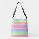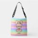 Sac carrossable rayé arc-en-ciel de couleur pastel, avec un lapin kawaii super mignon tenant une fraise. Il y a du texte personnalisable sur le devant où vous pouvez ajouter votre nom ou votre slogan