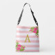 Monogramme d'or et fleurs de pivoine sur sac rayé rose clair et blanc.